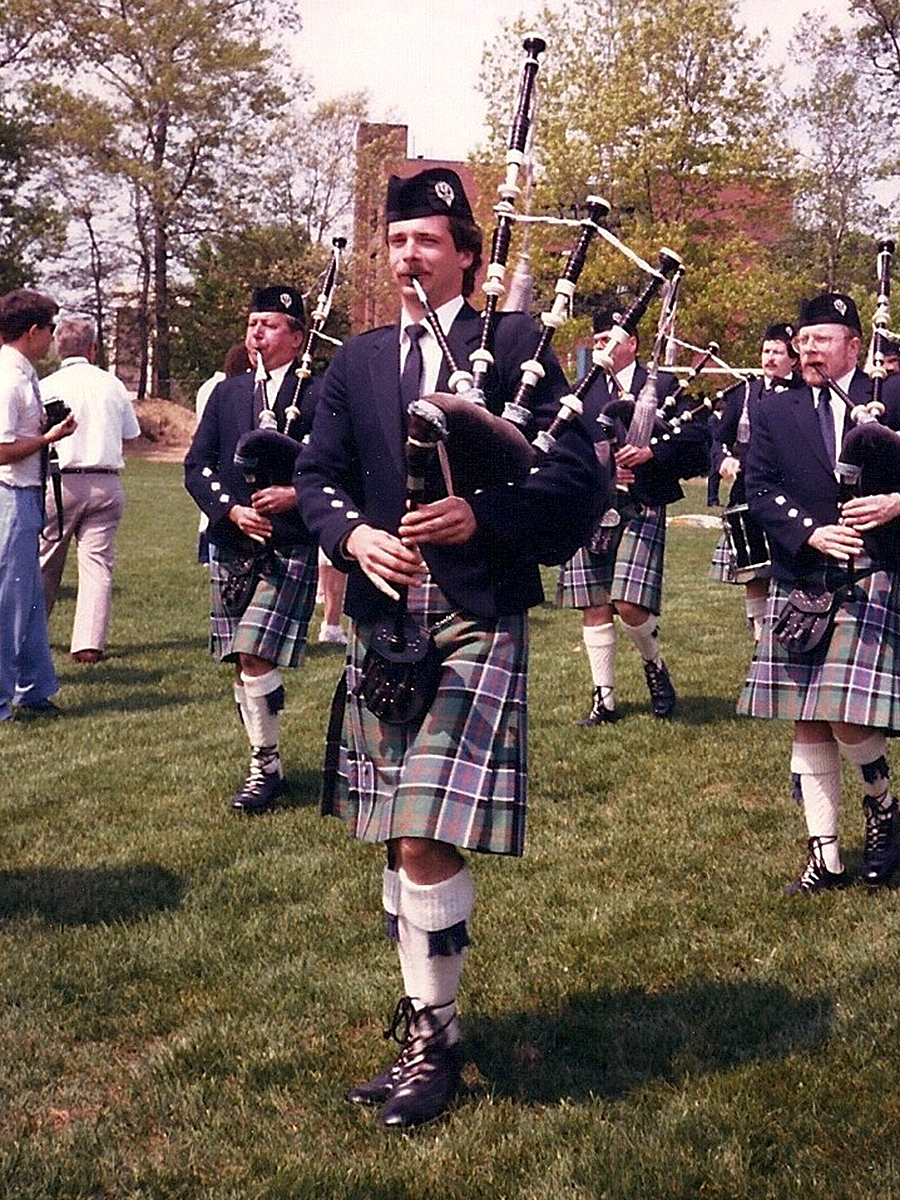 Chuck is originally from Michigan. His first instructor was Alec Matheson, but, his biggest influence was from lessons with George Duncan in Detroit. George was from Scotland, was PM of the Ford Pipe Band, and a top soloist and a judge. With Chuck as its new Pipe Major, the band moved in a new direction, and became one of the top competing U.S. pipe bands for many years to come.
